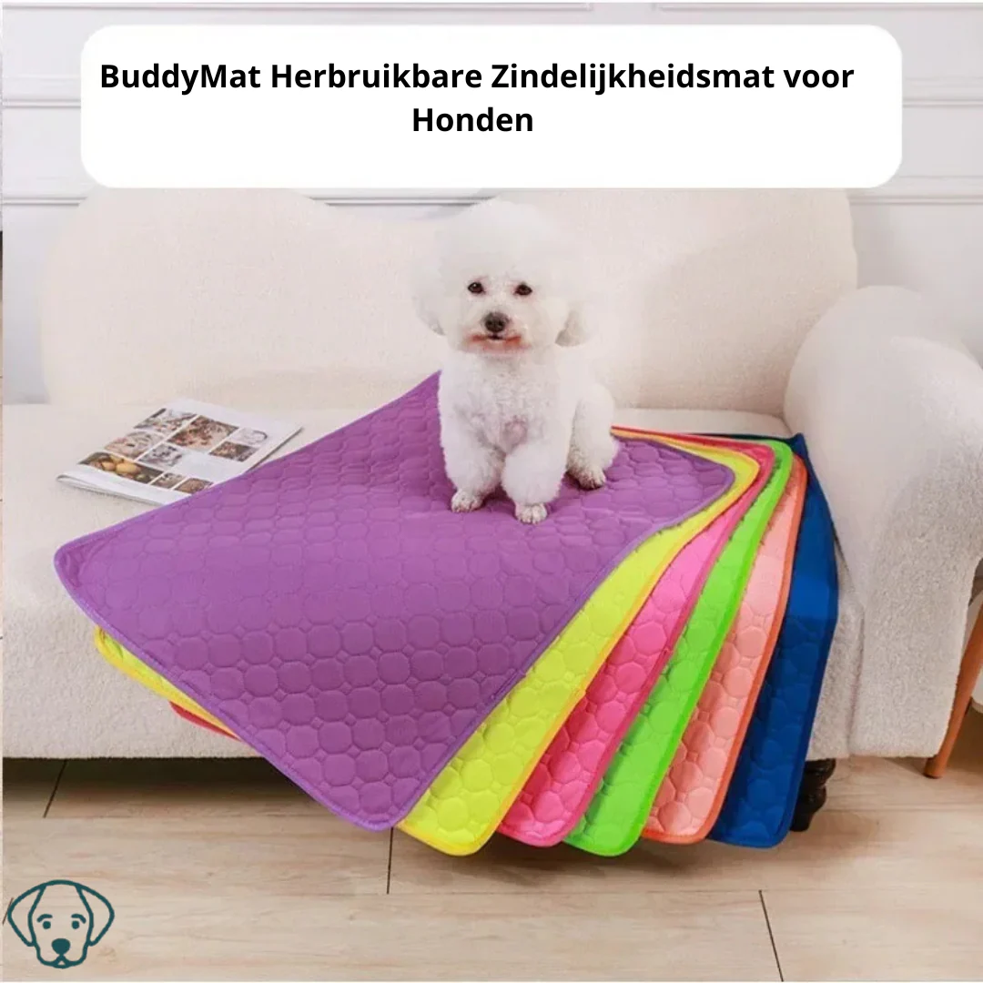 Deze veelzijdige, herbruikbare mat is de perfecte oplossing voor zindelijkheidstraining en bescherming van je huis. Dankzij de extra absorberende laag en het waterdichte ontwerp blijft je vloer schoon en droog. De BuddyMat is wasbaar in de machine en ontworpen voor langdurig gebruik, zodat je hond altijd een schoon en comfortabel plekje heeft.