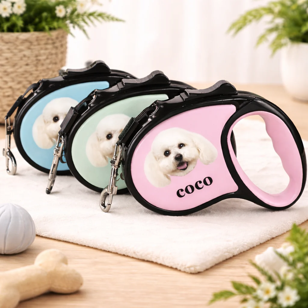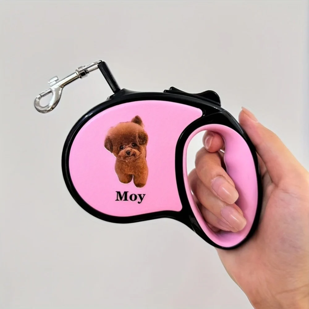 Deze uittrekbare hondenriem maakt elke wandeling persoonlijker. Met de foto en naam van jouw hond op de riem draag je hem altijd een beetje bij je, terwijl jullie samen ontspannen en veilig op pad gaan.