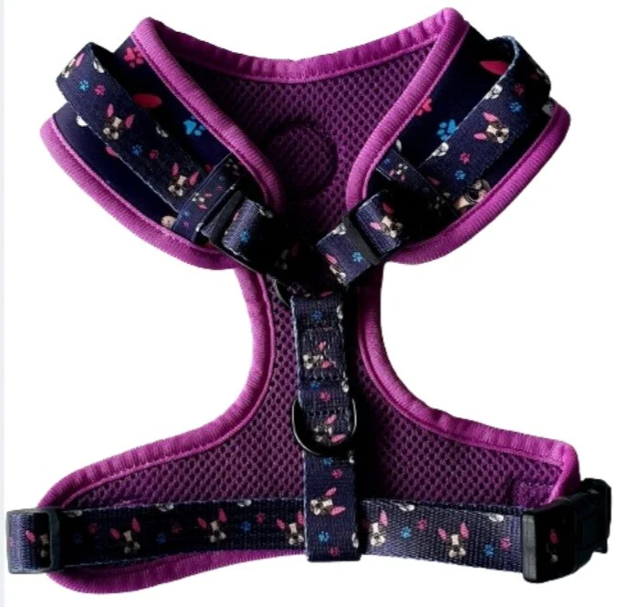Franse bulldog lovers y tuig met bijpassende riem.