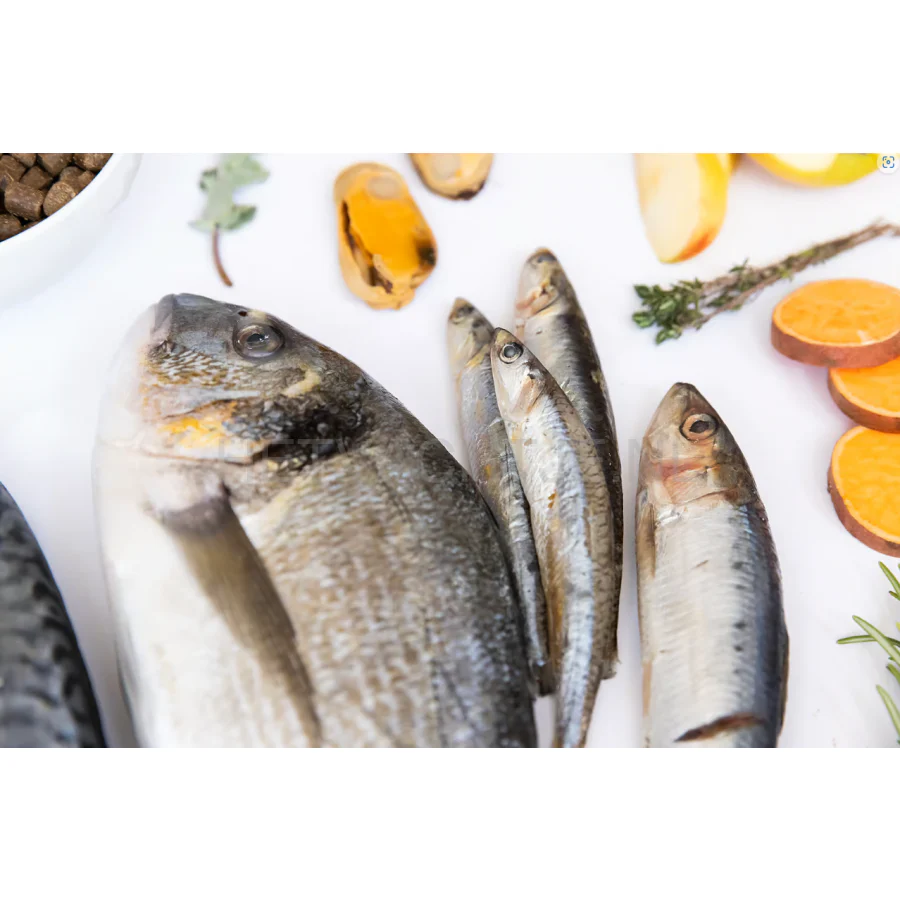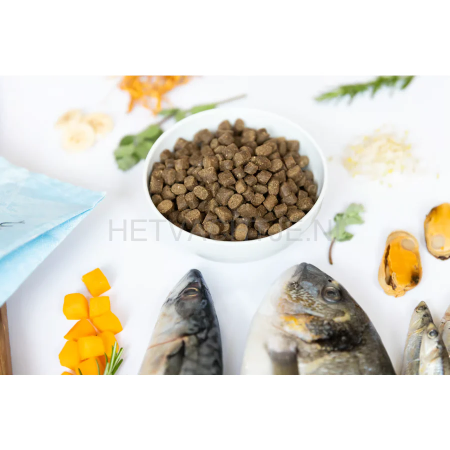 75% Verse Wild Gevangen Vis (25% Sardines, 25% Ansjovis, 15% Makreel, 10% Zeebrasem), 20% zoete aardappel, 3% gezondheidsmix: (banaan (5982 mg/kg), artisjok, cichorei, luzerne, appels (2393 mg/kg), pompoen, veenbessen (1795 mg/kg), groenlipmossel (1496 mg/kg), groene thee (1196 mg/kg), rozemarijn (897mg/kg), tijm (748 mg/kg), oregano (449 mg/kg), mariadistel, spirulina, olijfolie, yucca, cordyceps (179 mg/kg), shiitake, paardenbloem, gember, kurkuma), 1% forelolie, glucosamine (1000 mg/kg), chondroïtine (850 mg/kg), msm (650 mg/kg).