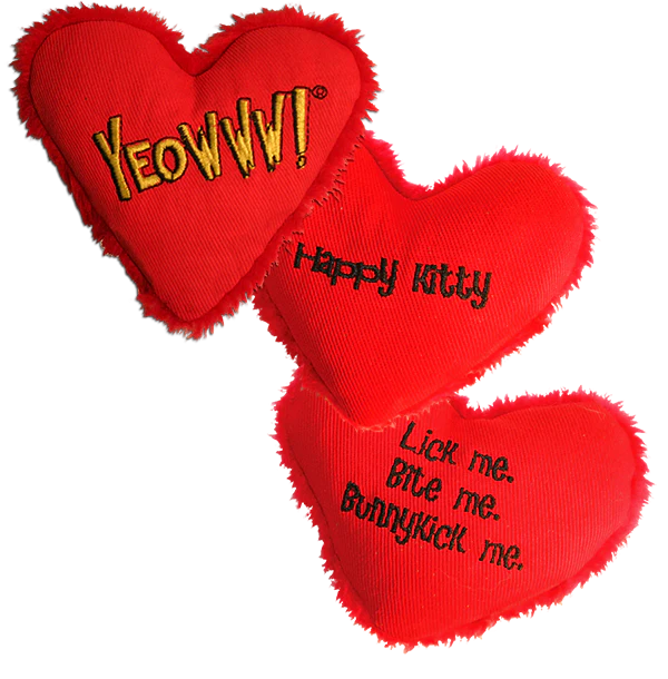 Bursting with attitude and completely stuffed full of organically grown YEOWWW! catnip, it’s no wonder this 4″ heart is an attack waiting to happen! Available in 3 different beautifully embroidered sayings: “Happy Kitty” “YEOWWW!” “Lick me. Bite me. Bunnykick me.”