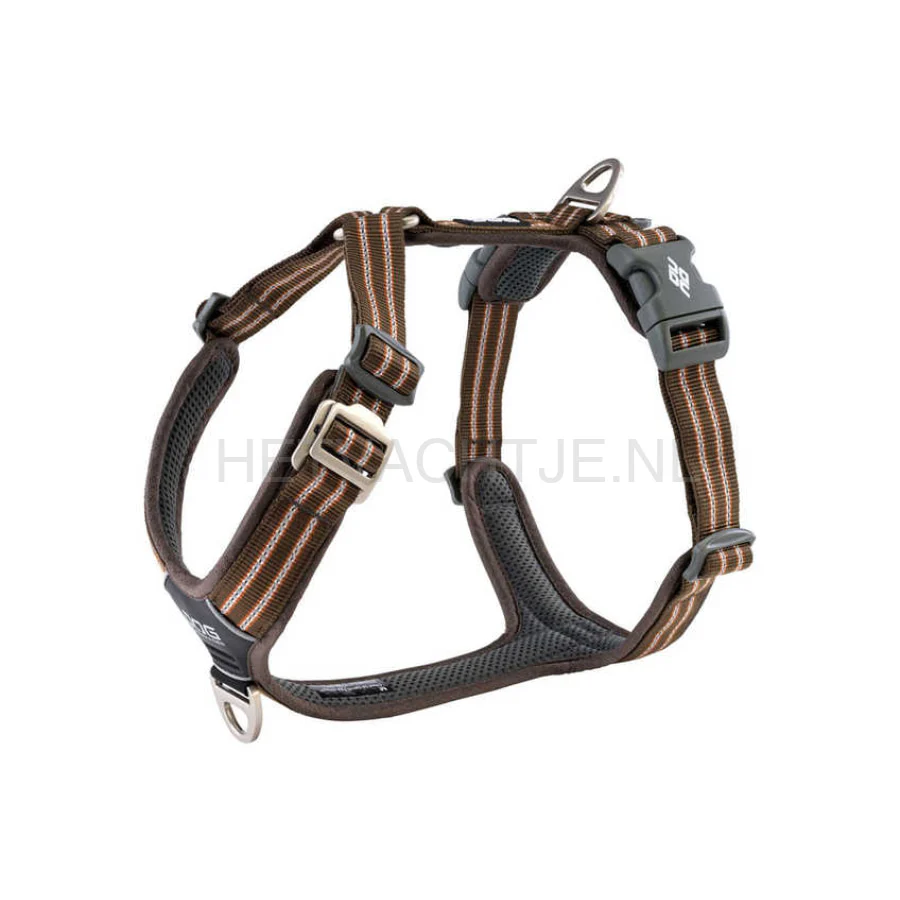Het tuig heeft een ring op de rug voor normale aanlijning van het tuig en een ring aan de voorkant waarmee u het tuig als hulpmiddel voor anti trek training kunt gebruiken.