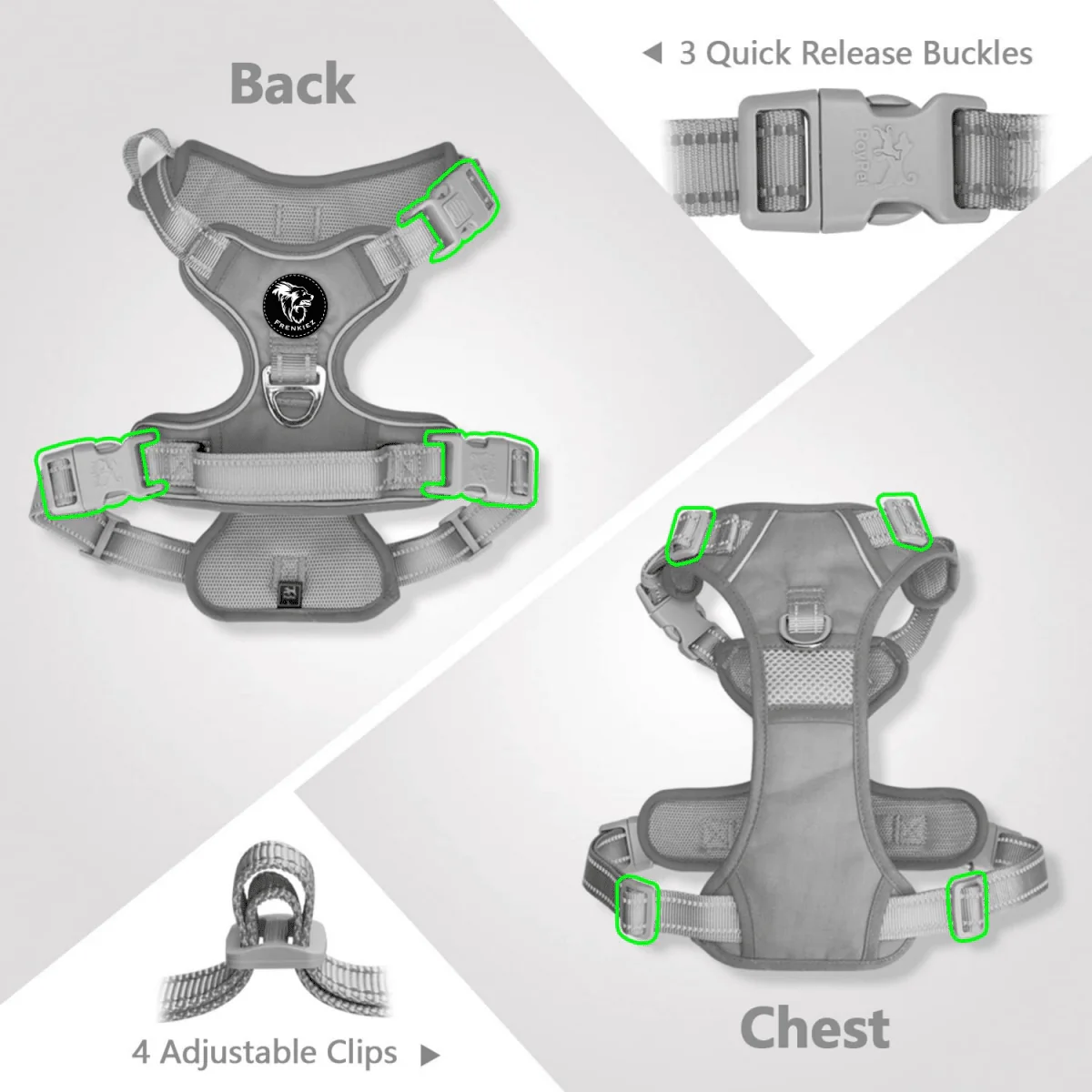 Dit verstelbare harnas heeft 2 handige gespen op de buikriemen en 1 vergrendelbare clip in de nek voor gemakkelijk aan- en uit doen, zonder dat je het over het hoofd van de hond moet doen. Onze frenkiez no pull hondentuigen hebben twee stevige metalen ringen waar je de looplijn aan kan bevestigen. Op de bovenkant van het tuig zit een stevige metalen ring, en aan de voorkant van het tuig zit ook een ring, welke te gebruiken is voor honden die hard aan de lijn trekken. Het hondentuig is zacht ademend met mesh stof, de trekdruk wordt gelijkmatig over het lichaam verdeeld om verstikking te voorkomen. Dit stevige hondenharnas is perfect voor dagelijks wandelen, hardlopen, trainen, jagen, buitenavonturen en nog veel meer!