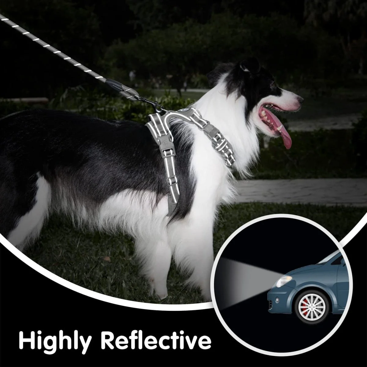 Gevoerde en comfortabele handgreep boven op het tuig, zachte voering zorgt voor een handvat dat goed voelt in de hand voor extra controle om uw hond te begeleiden. Het werkt ook als autogordellus. Reflecterend stiksel met groot oppervlak voor gebruik ’s nachts voor extra zichtbaarheid. Lichtgewicht en duurzaam, ontworpen met minimale massa voor maximale vingergevoeligheid. 3 manieren verstelbare bandjes, het tuig is volledig te verstellen en aan te passen met ruimte voor groei.