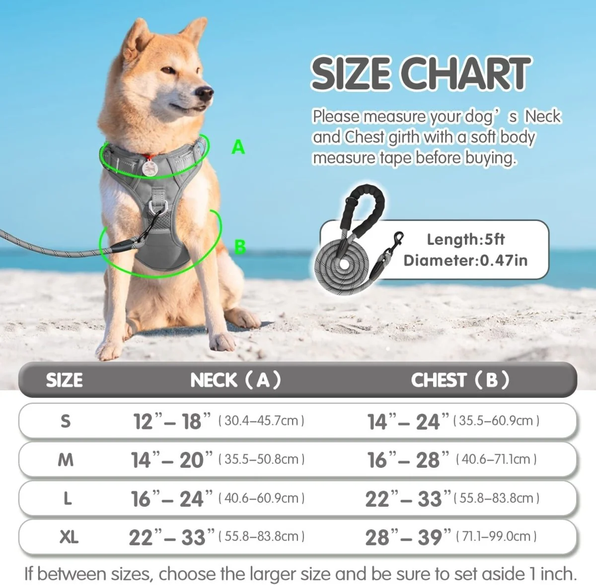 Om er zeker van te zijn dat u de juiste maat voor uw huisdier bestelt, is het belangrijk om het dier goed op te meten. Aan de hand van de onderstaande maattabel kunt u de juiste maat kiezen voor uw hond. Mocht de maat niet goed zijn, mag het tuigje uiteraard omgeruild worden voor een maat groter of kleiner.