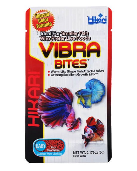 Hikari Vibra Bites is een uniek voer dat ontworpen is om de vorm en beweging van levende rode muggenlarven na te bootsen. Hikari Tropical Vibra Bites Baby is zeer langzaam zinkend voer wat beweegt door de stroming in het water, zoals levend voer ook zou doen.