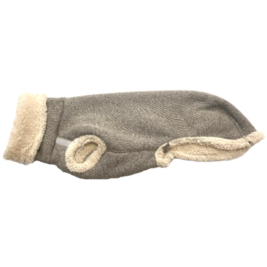 Grijze omgekeerd lam trui met een gleuf voor de riem. Voor de Windhond.