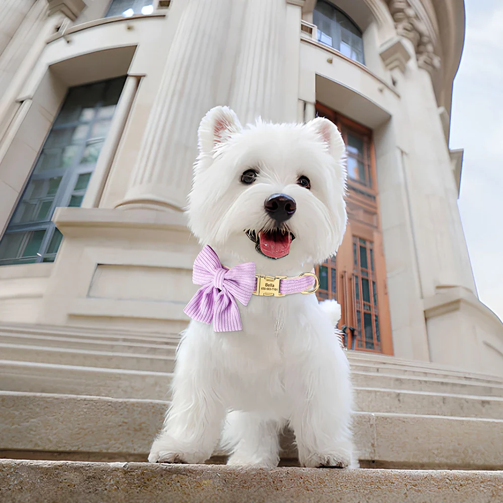 Met deze fluweelzachte hondenhalsband geef je je hond een unieke en schattige look. De zachte velvet stof voelt prettig aan, terwijl de strik zorgt voor een extra lieve uitstraling. Dankzij de gravering met naam en telefoonnummer gaat je hond niet alleen stijlvol, maar ook veilig op pad.