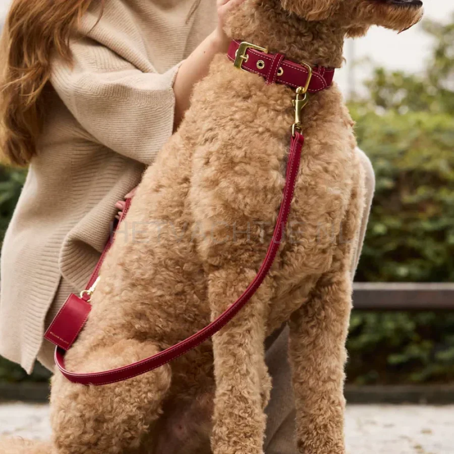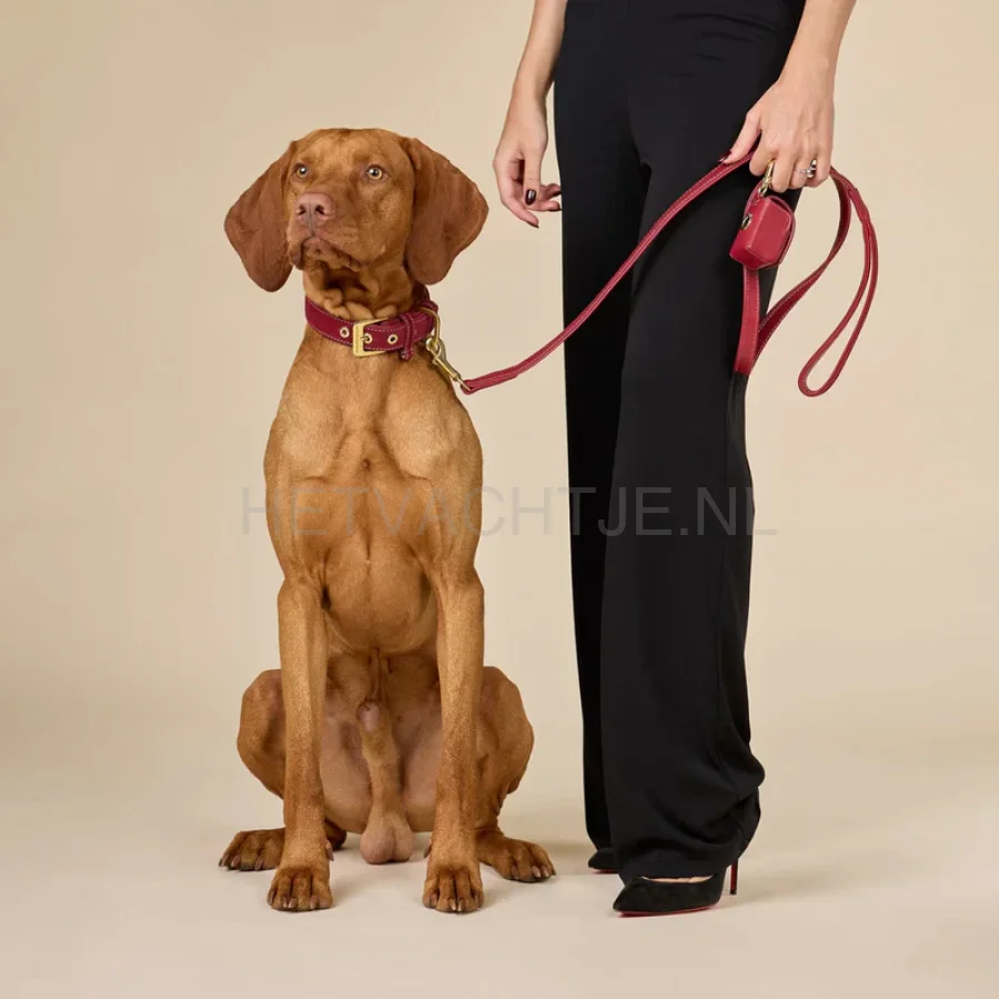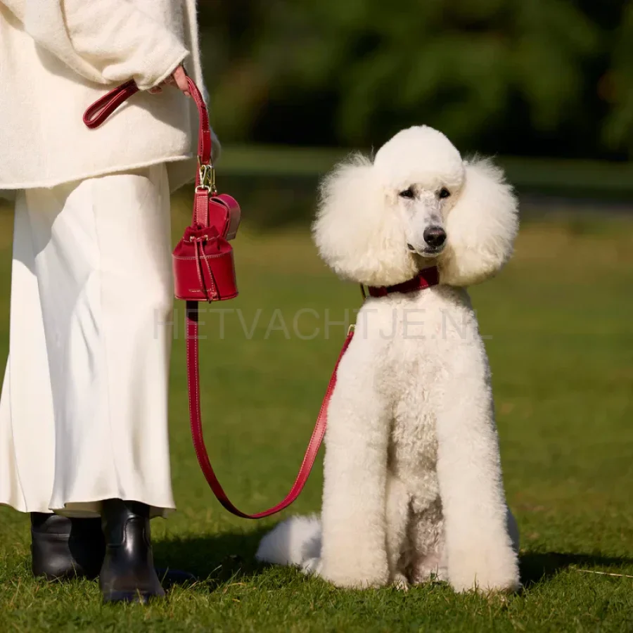 Handgemaakte poepzakjesdispenser van luxueus dieprood glad leer met een praktische opening aan de achterkant om de zakjes uit te trekken.